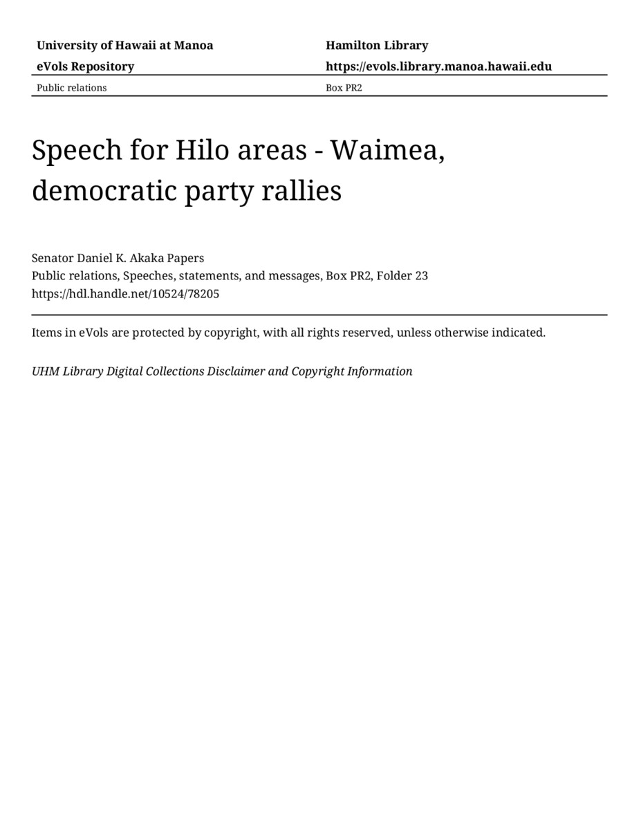 Speech for Hilo areas - Waimea, democratic party rallies, August 29, 1980, MANUSCRIPT-HCPC00010, Public relations, Speeches, statements, and messages, Box PR2, Folder 23, Senator Daniel K. Akaka Papers, Hawaiʻi Congressional Papers Collection, University of Hawaiʻi at Mānoa Library, Honolulu, HI. https://congressarchives.org/catalog/10524_78205 (accessed March 20, 2026).