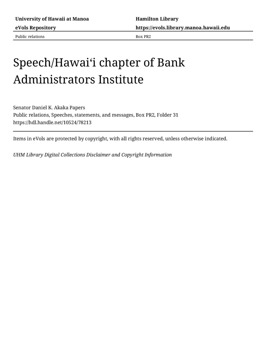 Speech/Hawaiʻi chapter of Bank Administrators Institute, October 14, 1980, MANUSCRIPT-HCPC00010, Public relations, Speeches, statements, and messages, Box PR2, Folder 31, Senator Daniel K. Akaka Papers, Hawaiʻi Congressional Papers Collection, University of Hawaiʻi at Mānoa Library, Honolulu, HI. https://congressarchives.org/catalog/10524_78213 (accessed March 19, 2026).