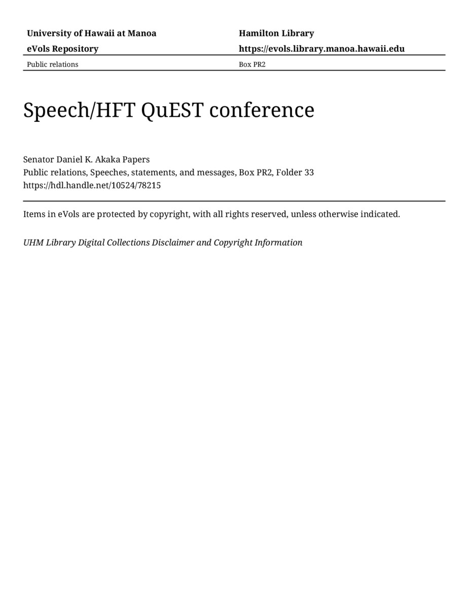 Speech/HFT QuEST conference, October 18, 1980, MANUSCRIPT-HCPC00010, Public relations, Speeches, statements, and messages, Box PR2, Folder 33, Senator Daniel K. Akaka Papers, Hawaiʻi Congressional Papers Collection, University of Hawaiʻi at Mānoa Library, Honolulu, HI. https://congressarchives.org/catalog/10524_78215 (accessed March 18, 2026).
