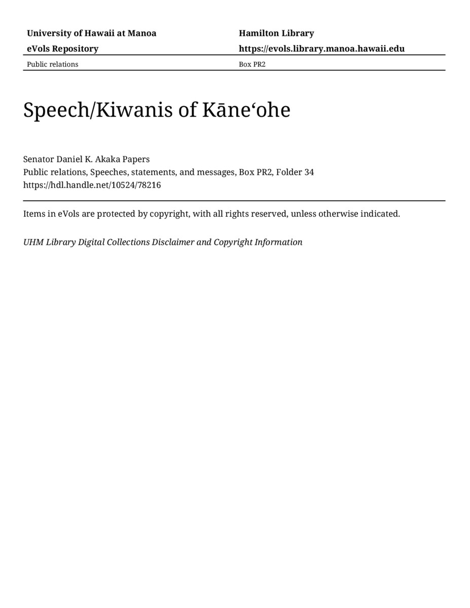 Speech/Kiwanis of Kāneʻohe, October 23, 1980, MANUSCRIPT-HCPC00010, Public relations, Speeches, statements, and messages, Box PR2, Folder 34, Senator Daniel K. Akaka Papers, Hawaiʻi Congressional Papers Collection, University of Hawaiʻi at Mānoa Library, Honolulu, HI. https://congressarchives.org/catalog/10524_78216 (accessed March 20, 2026).