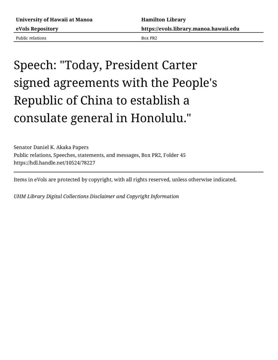 Speech: "Today, President Carter signed agreements with the People's Republic of China to establish a consulate general in Honolulu.", approximately 1980, MANUSCRIPT-HCPC00010, Public relations, Speeches, statements, and messages, Box PR2, Folder 45, Senator Daniel K. Akaka Papers, Hawaiʻi Congressional Papers Collection, University of Hawaiʻi at Mānoa Library, Honolulu, HI. https://congressarchives.org/catalog/10524_78227 (accessed April 30, 2026).