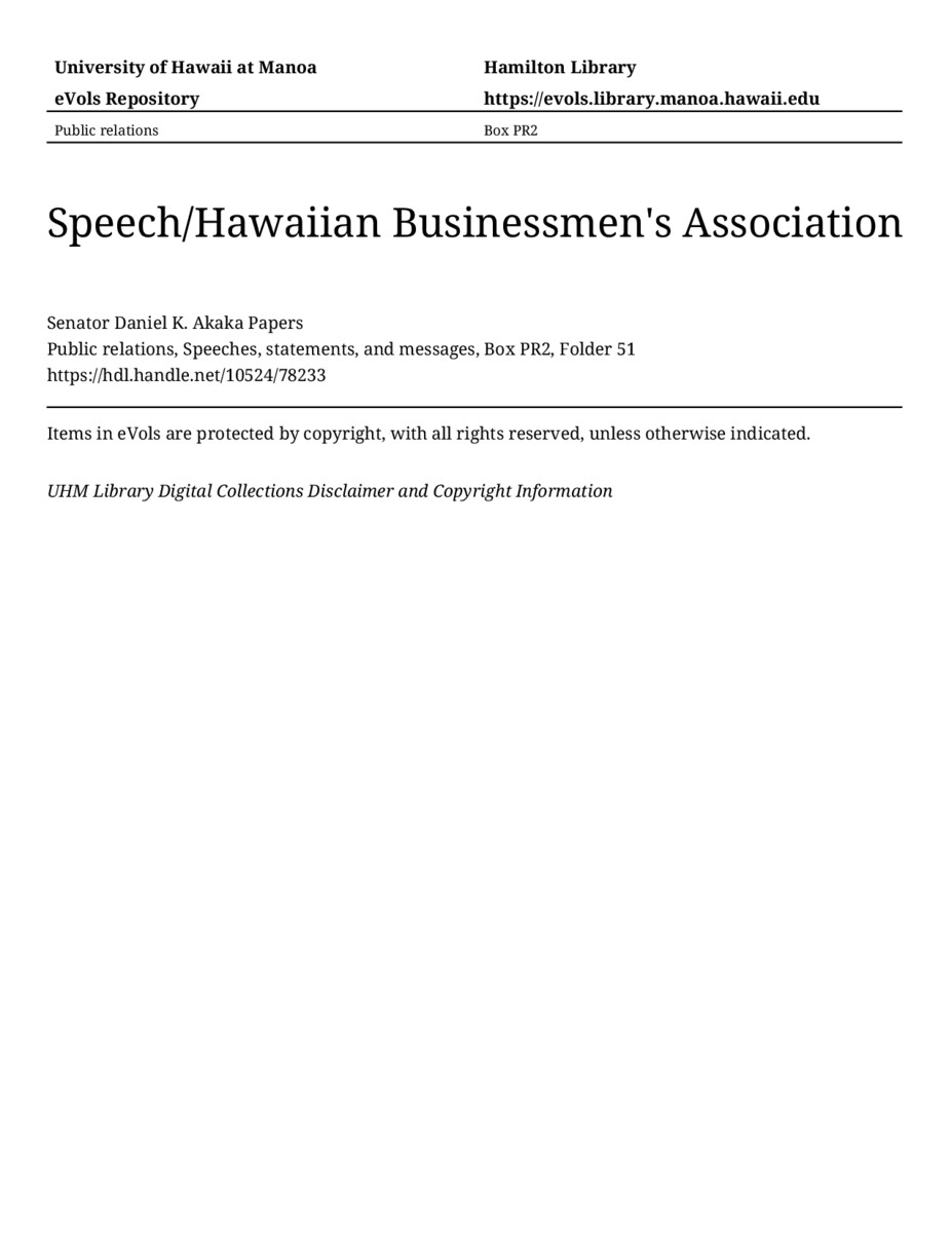 Speech/Hawaiian Businessmen's Association, April 23, 1981, MANUSCRIPT-HCPC00010, Public relations, Speeches, statements, and messages, Box PR2, Folder 51, Senator Daniel K. Akaka Papers, Hawaiʻi Congressional Papers Collection, University of Hawaiʻi at Mānoa Library, Honolulu, HI. https://congressarchives.org/catalog/10524_78233 (accessed March 17, 2026).