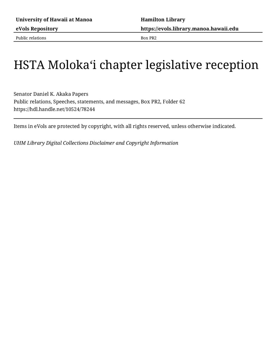 HSTA Molokaʻi chapter legislative reception, December 3, 1981, MANUSCRIPT-HCPC00010, Public relations, Speeches, statements, and messages, Box PR2, Folder 62, Senator Daniel K. Akaka Papers, Hawaiʻi Congressional Papers Collection, University of Hawaiʻi at Mānoa Library, Honolulu, HI. https://congressarchives.org/catalog/10524_78244 (accessed March 18, 2026).