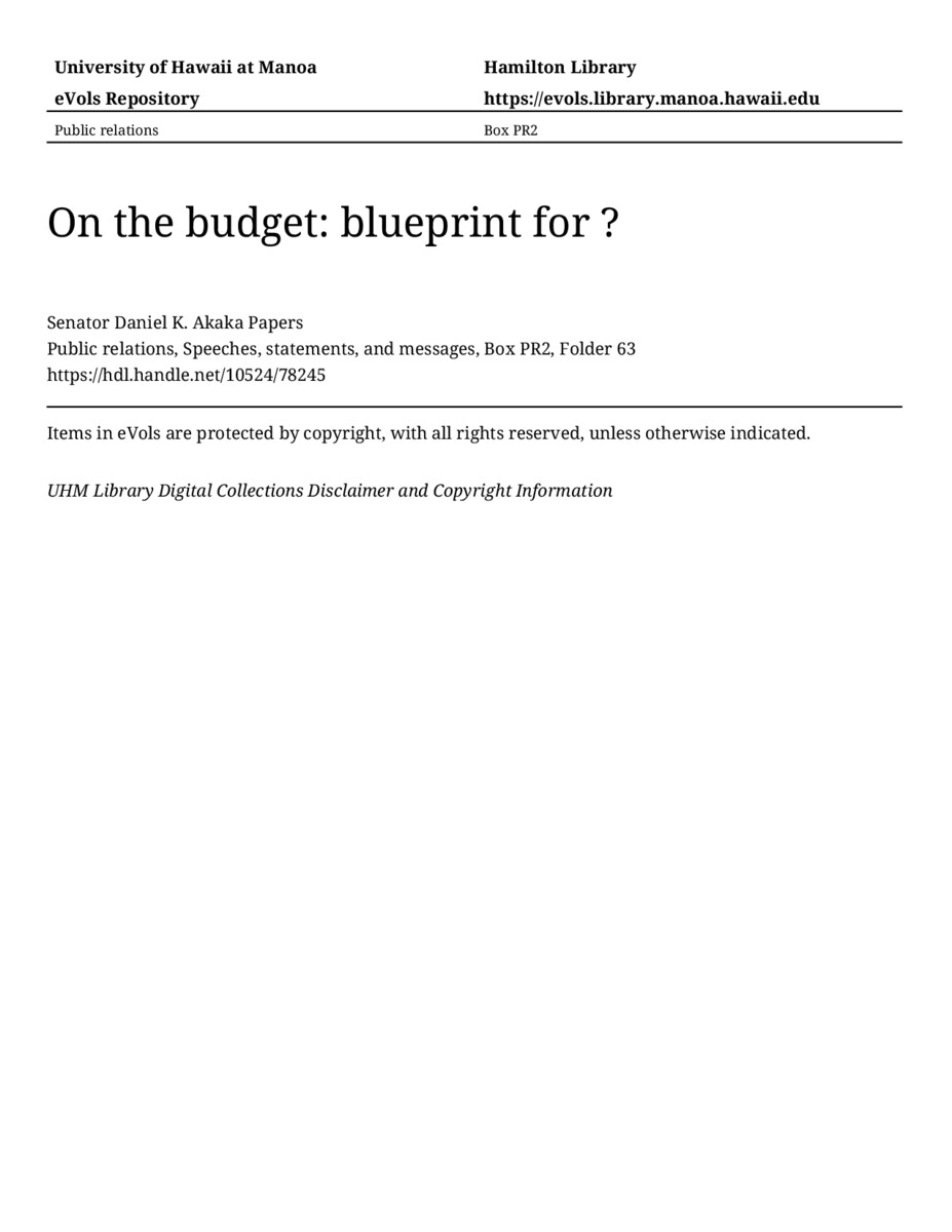 On the budget: blueprint for ?, December 1, 1981, MANUSCRIPT-HCPC00010, Public relations, Speeches, statements, and messages, Box PR2, Folder 63, Senator Daniel K. Akaka Papers, Hawaiʻi Congressional Papers Collection, University of Hawaiʻi at Mānoa Library, Honolulu, HI. https://congressarchives.org/catalog/10524_78245 (accessed March 20, 2026).