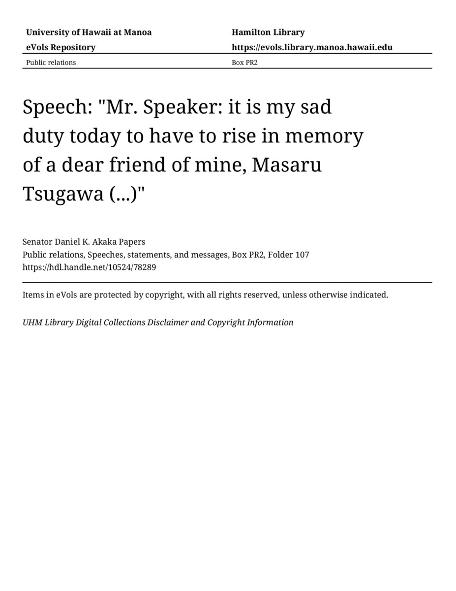 Speech: "Mr. Speaker: it is my sad duty today to have to rise in memory of a dear friend of mine, Masaru Tsugawa (...)", September 27, 1983, MANUSCRIPT-HCPC00010, Public relations, Speeches, statements, and messages, Box PR2, Folder 107, Senator Daniel K. Akaka Papers, Hawaiʻi Congressional Papers Collection, University of Hawaiʻi at Mānoa Library, Honolulu, HI. https://congressarchives.org/catalog/10524_78289 (accessed March 20, 2026).