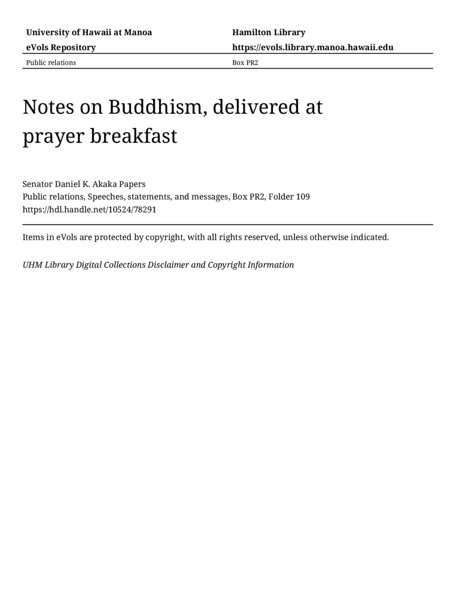Notes on Buddhism, delivered at prayer breakfast, November 3, 1983, MANUSCRIPT-HCPC00010, Public relations, Speeches, statements, and messages, Box PR2, Folder 109, Senator Daniel K. Akaka Papers, Hawaiʻi Congressional Papers Collection, University of Hawaiʻi at Mānoa Library, Honolulu, HI. https://congressarchives.org/catalog/10524_78291 (accessed March 19, 2026).
