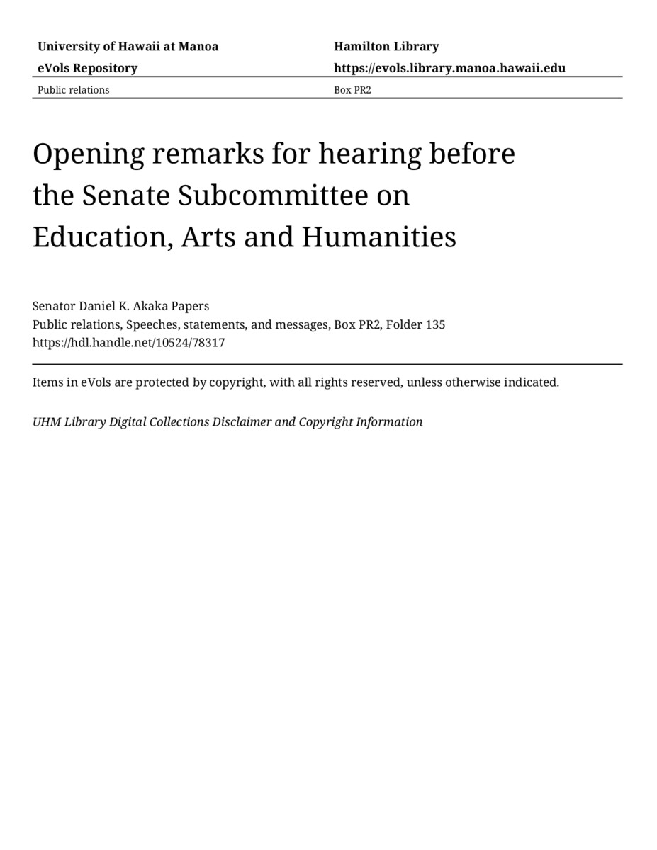 - Opening remarks for hearing before the Senate Subcommittee on Education, Arts and Humanities