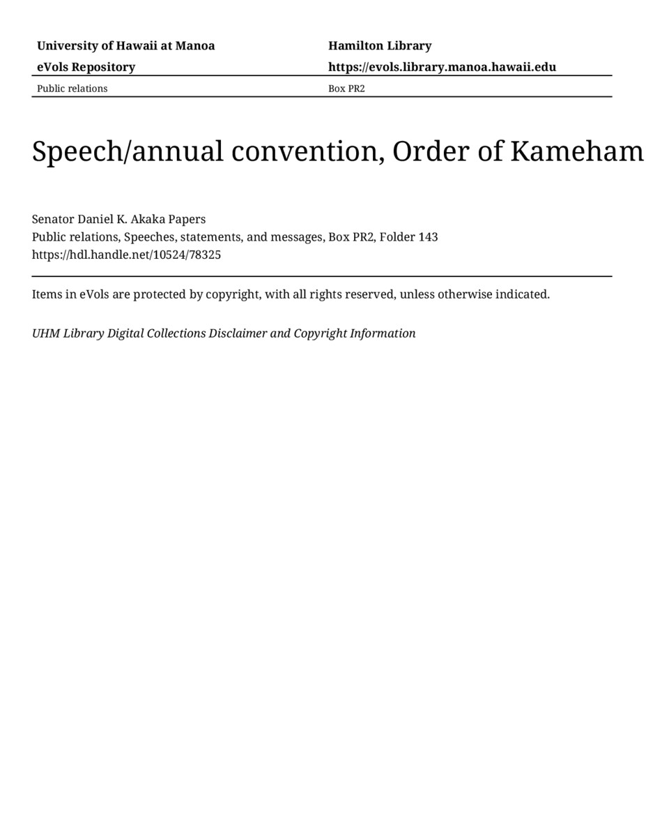 Speech/annual convention, Order of Kamehameha, August 28, 1987, MANUSCRIPT-HCPC00010, Public relations, Speeches, statements, and messages, Box PR2, Folder 143, Senator Daniel K. Akaka Papers, Hawaiʻi Congressional Papers Collection, University of Hawaiʻi at Mānoa Library, Honolulu, HI. https://congressarchives.org/catalog/10524_78325 (accessed March 19, 2026).