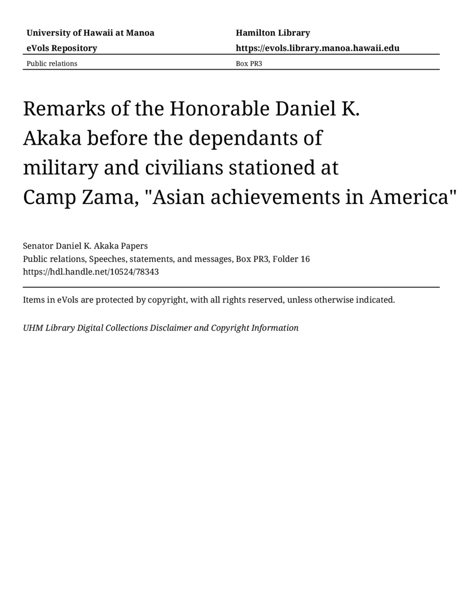 Remarks of the Honorable Daniel K. Akaka before the dependants of military and civilians stationed at Camp Zama, "Asian achievements in America", May 19, 1988, MANUSCRIPT-HCPC00010, Public relations, Speeches, statements, and messages, Box PR3, Folder 16, Senator Daniel K. Akaka Papers, Hawaiʻi Congressional Papers Collection, University of Hawaiʻi at Mānoa Library, Honolulu, HI. https://congressarchives.org/catalog/10524_78343 (accessed March 20, 2026).