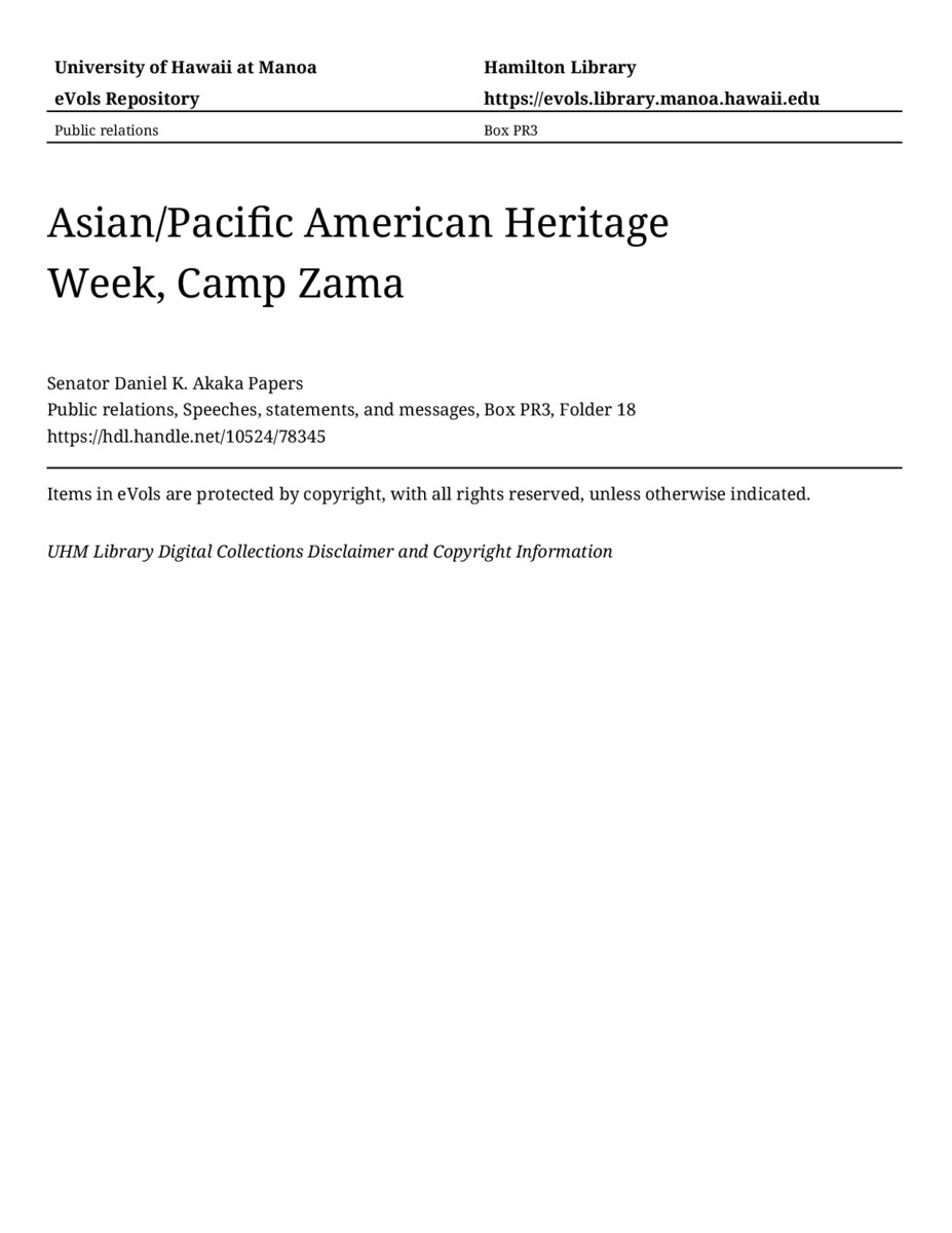 Asian/Pacific American Heritage Week, Camp Zama, May 20, 1988, MANUSCRIPT-HCPC00010, Public relations, Speeches, statements, and messages, Box PR3, Folder 18, Senator Daniel K. Akaka Papers, Hawaiʻi Congressional Papers Collection, University of Hawaiʻi at Mānoa Library, Honolulu, HI. https://congressarchives.org/catalog/10524_78345 (accessed March 20, 2026).