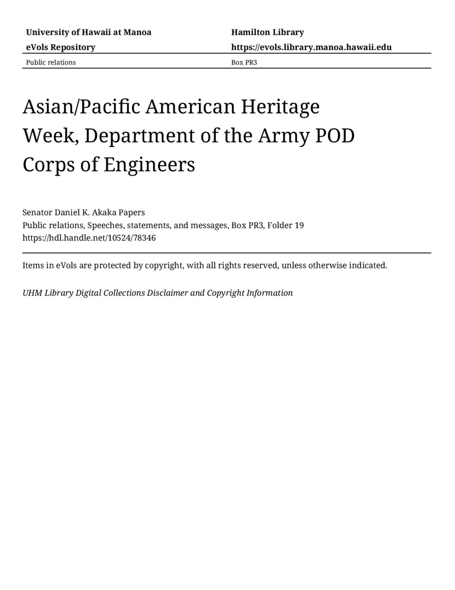- Asian/Pacific American Heritage Week, Department of the Army POD Corps of Engineers