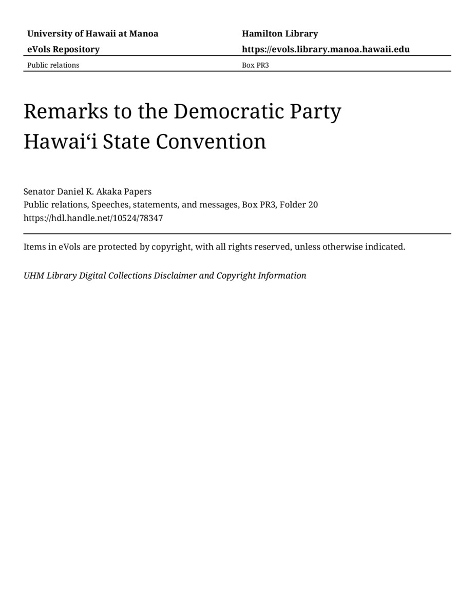Remarks to the Democratic Party Hawaiʻi State Convention, May 28, 1988, MANUSCRIPT-HCPC00010, Public relations, Speeches, statements, and messages, Box PR3, Folder 20, Senator Daniel K. Akaka Papers, Hawaiʻi Congressional Papers Collection, University of Hawaiʻi at Mānoa Library, Honolulu, HI. https://congressarchives.org/catalog/10524_78347 (accessed March 20, 2026).