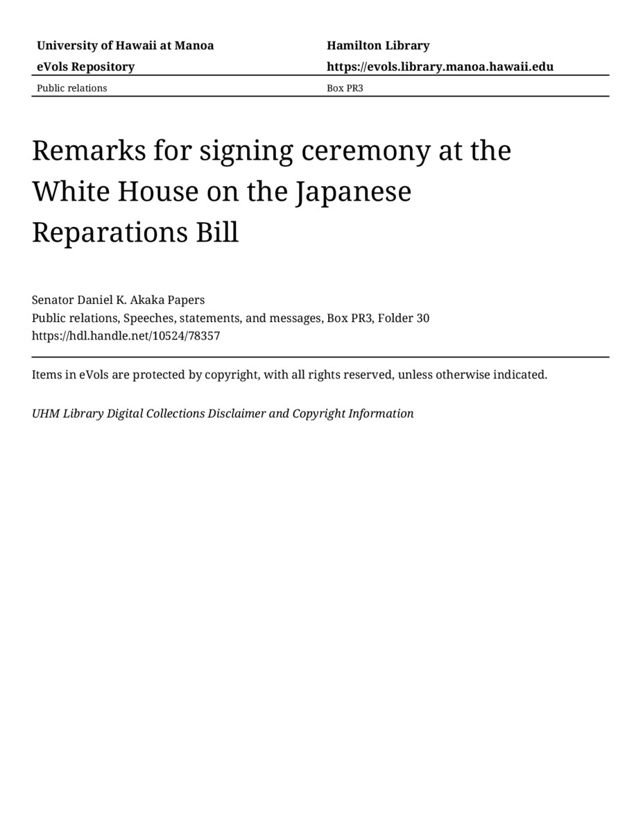 - Remarks for signing ceremony at the White House on the Japanese Reparations Bill