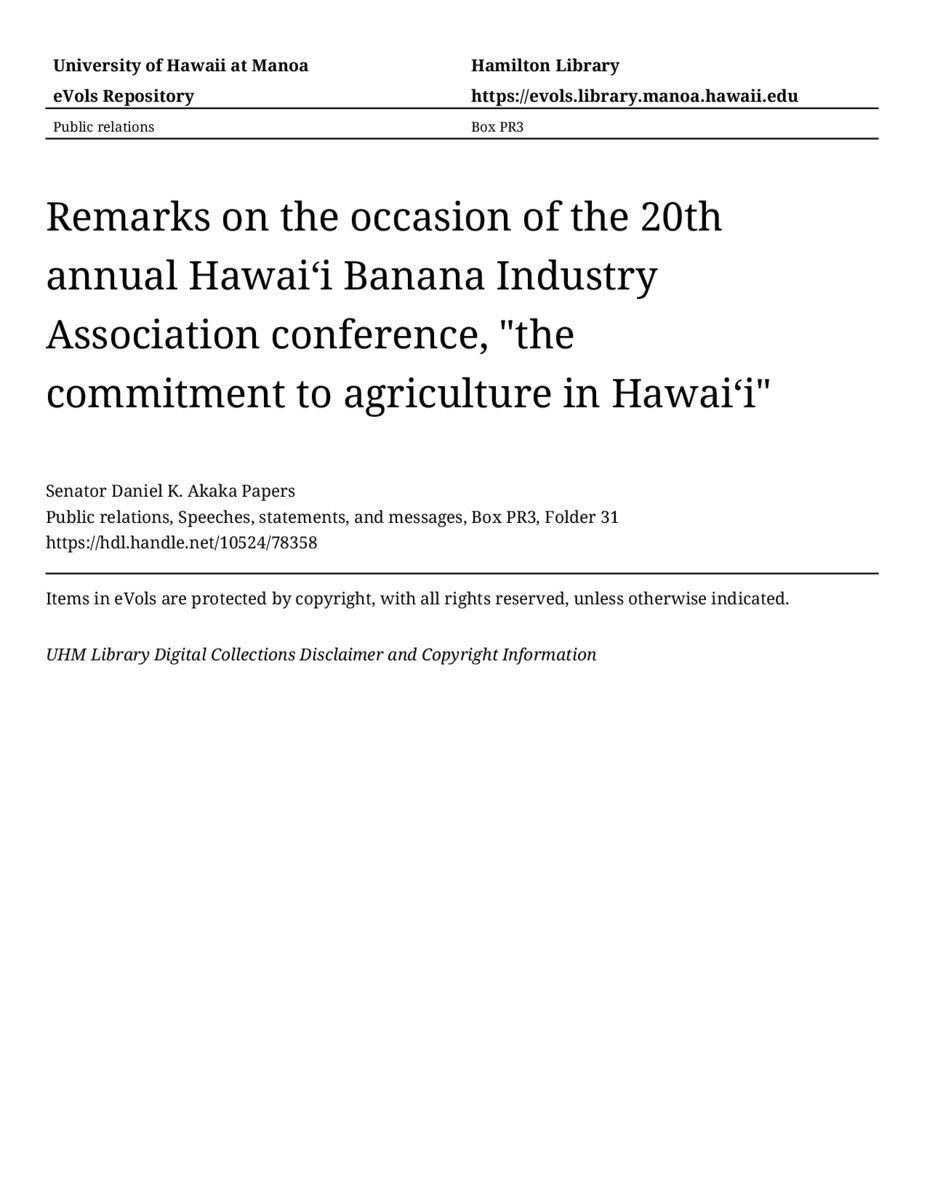 Remarks on the occasion of the 20th annual Hawaiʻi Banana Industry Association conference, "the commitment to agriculture in Hawaiʻi", August 12, 1988, MANUSCRIPT-HCPC00010, Public relations, Speeches, statements, and messages, Box PR3, Folder 31, Senator Daniel K. Akaka Papers, Hawaiʻi Congressional Papers Collection, University of Hawaiʻi at Mānoa Library, Honolulu, HI. https://congressarchives.org/catalog/10524_78358 (accessed March 21, 2026).