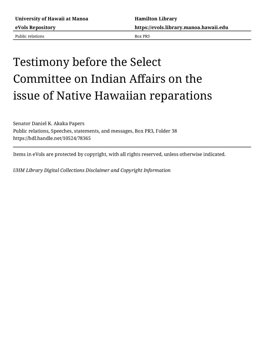 - Testimony before the Select Committee on Indian Affairs on the issue of Native Hawaiian reparations