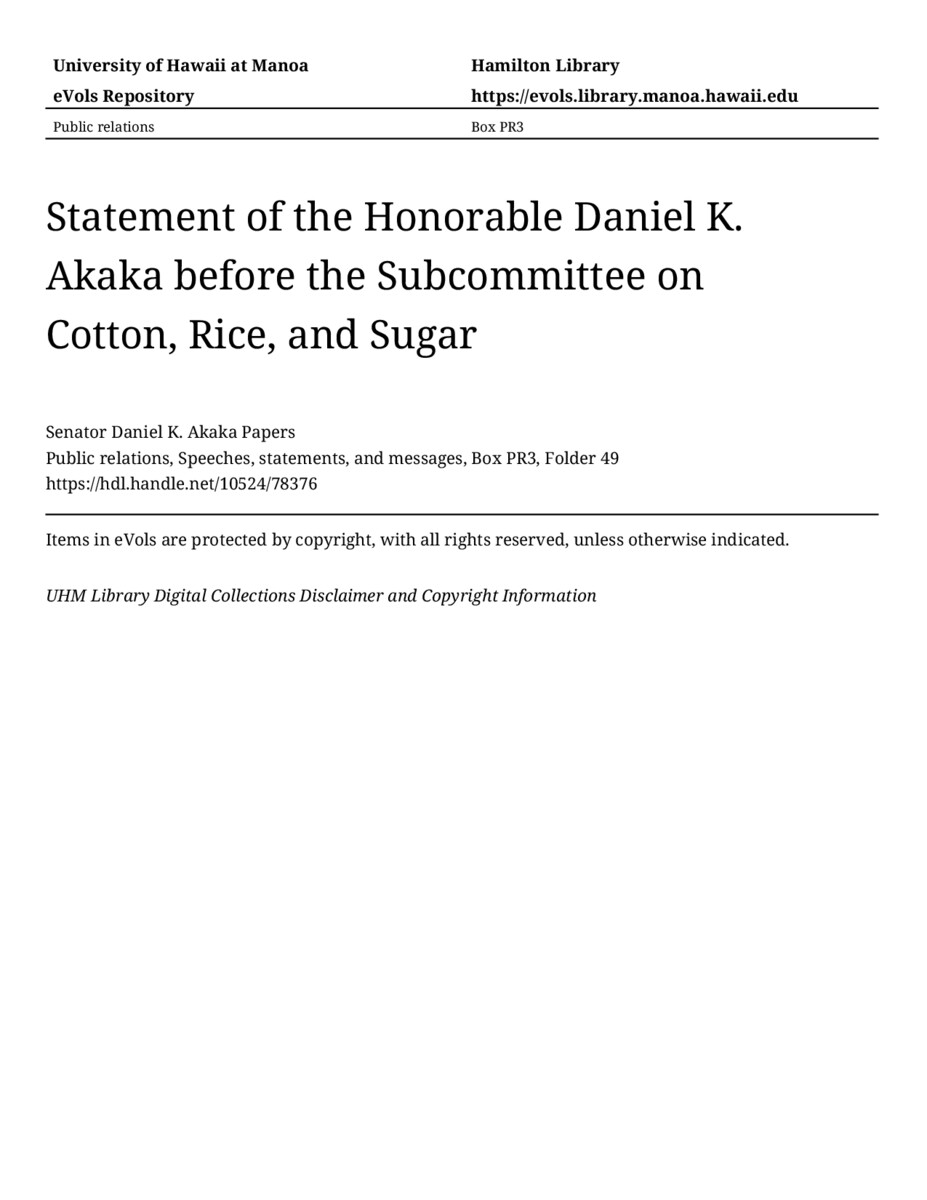 - Statement of the Honorable Daniel K. Akaka before the Subcommittee on Cotton, Rice, and Sugar