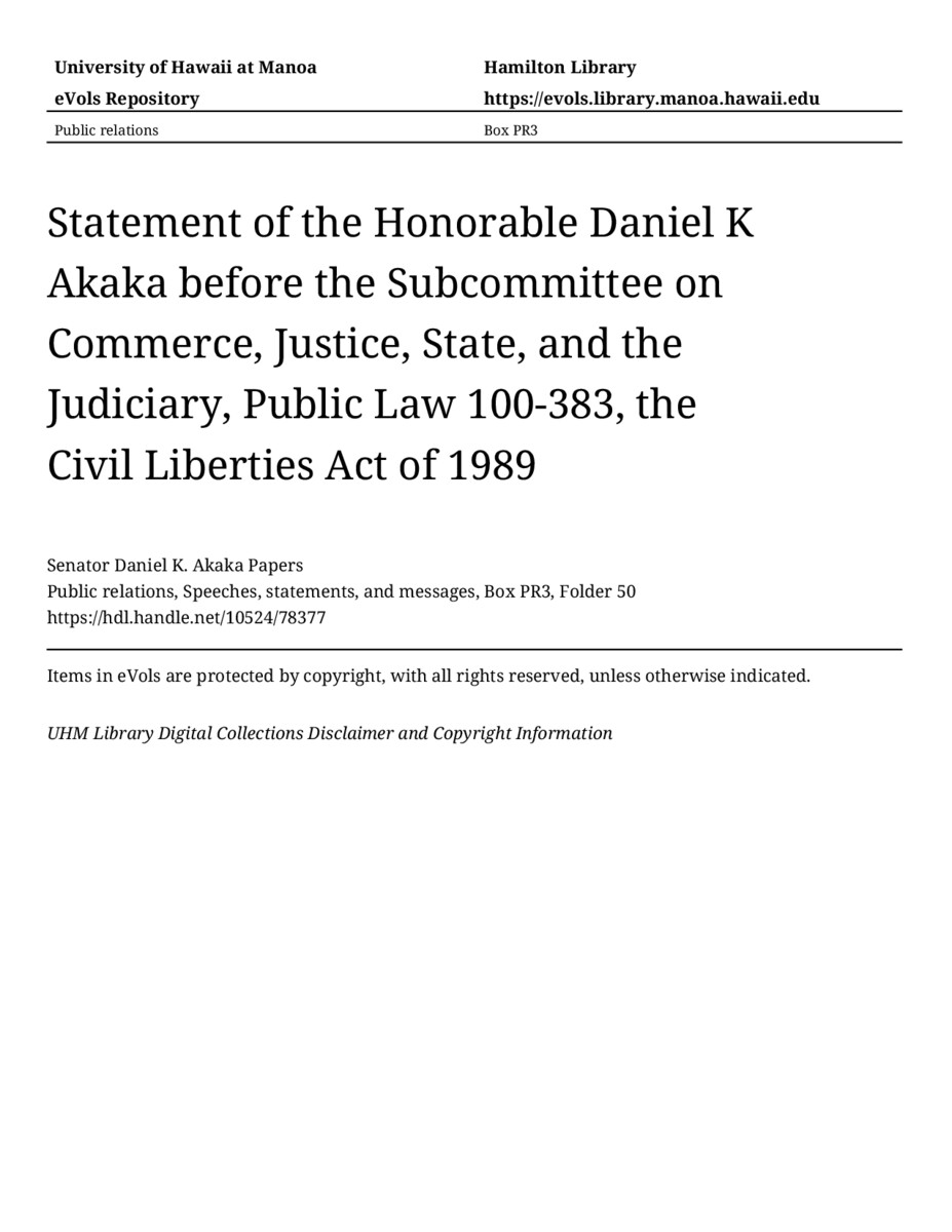 Statement of the Honorable Daniel K Akaka before the Subcommittee on Commerce, Justice, State, and the Judiciary, Public Law 100-383, the Civil Liberties Act of 1989, April 5, 1989, MANUSCRIPT-HCPC00010, Public relations, Speeches, statements, and messages, Box PR3, Folder 50, Senator Daniel K. Akaka Papers, Hawaiʻi Congressional Papers Collection, University of Hawaiʻi at Mānoa Library, Honolulu, HI. https://congressarchives.org/catalog/10524_78377 (accessed March 20, 2026).