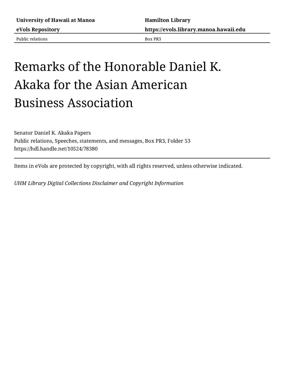 Remarks of the Honorable Daniel K. Akaka for the Asian American Business Association