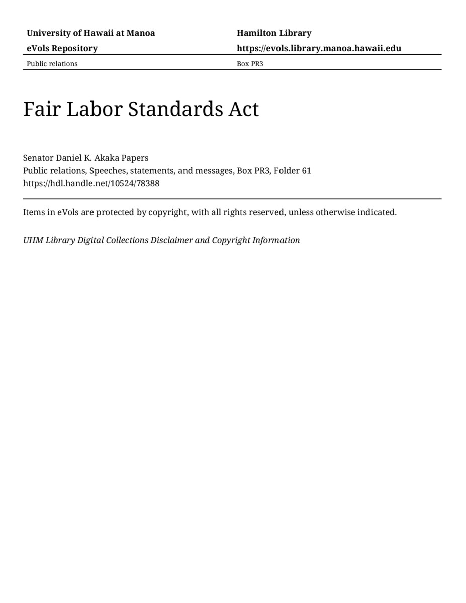 Fair Labor Standards Act, May 17, 1989, MANUSCRIPT-HCPC00010, Public relations, Speeches, statements, and messages, Box PR3, Folder 61, Senator Daniel K. Akaka Papers, Hawaiʻi Congressional Papers Collection, University of Hawaiʻi at Mānoa Library, Honolulu, HI. https://congressarchives.org/catalog/10524_78388 (accessed March 20, 2026).