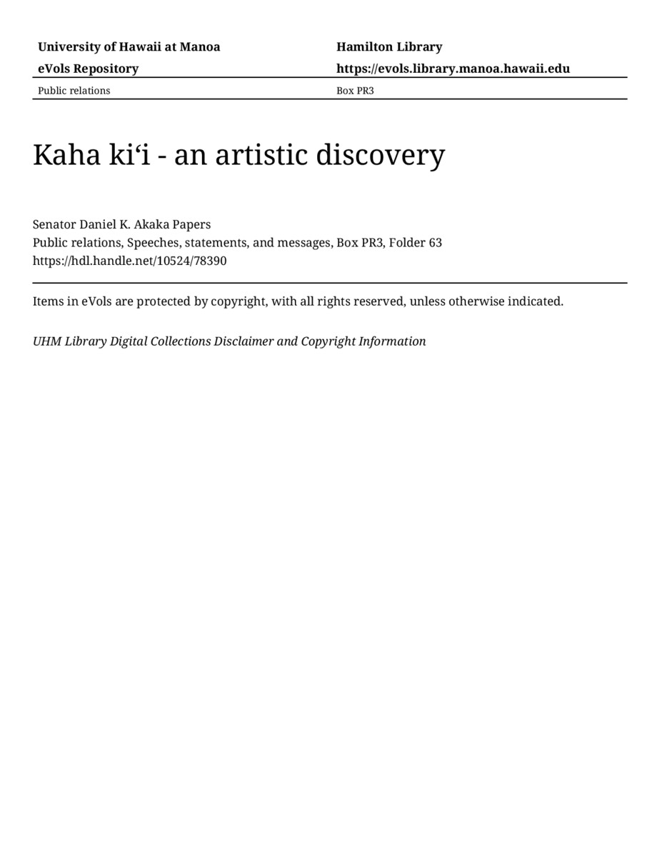 Kaha kiʻi - an artistic discovery, June 1, 1989, MANUSCRIPT-HCPC00010, Public relations, Speeches, statements, and messages, Box PR3, Folder 63, Senator Daniel K. Akaka Papers, Hawaiʻi Congressional Papers Collection, University of Hawaiʻi at Mānoa Library, Honolulu, HI. https://congressarchives.org/catalog/10524_78390 (accessed March 20, 2026).