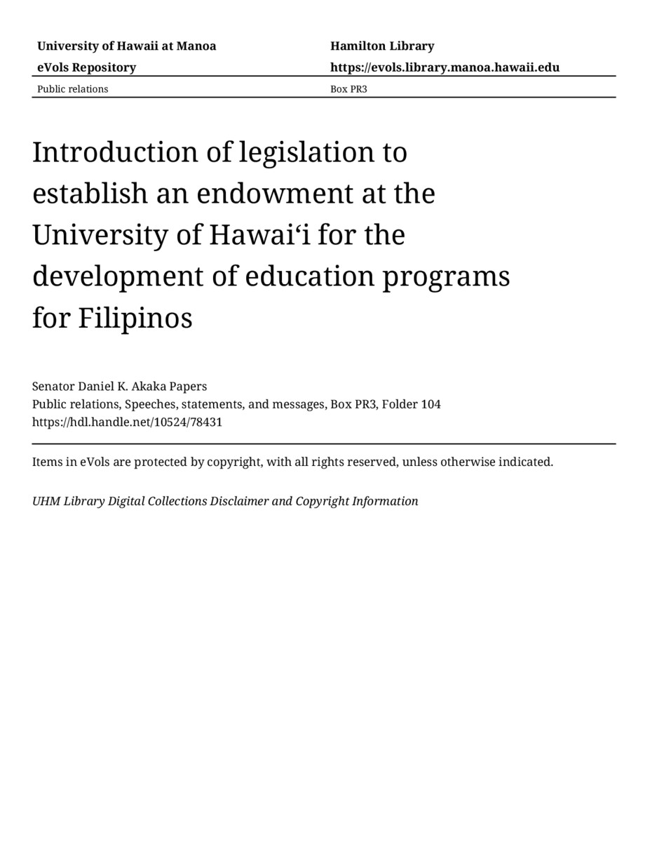 Introduction of legislation to establish an endowment at the University of Hawaiʻi for the development of education programs for Filipinos, August 4, 1990, MANUSCRIPT-HCPC00010, Public relations, Speeches, statements, and messages, Box PR3, Folder 104, Senator Daniel K. Akaka Papers, Hawaiʻi Congressional Papers Collection, University of Hawaiʻi at Mānoa Library, Honolulu, HI. https://congressarchives.org/catalog/10524_78431 (accessed March 19, 2026).