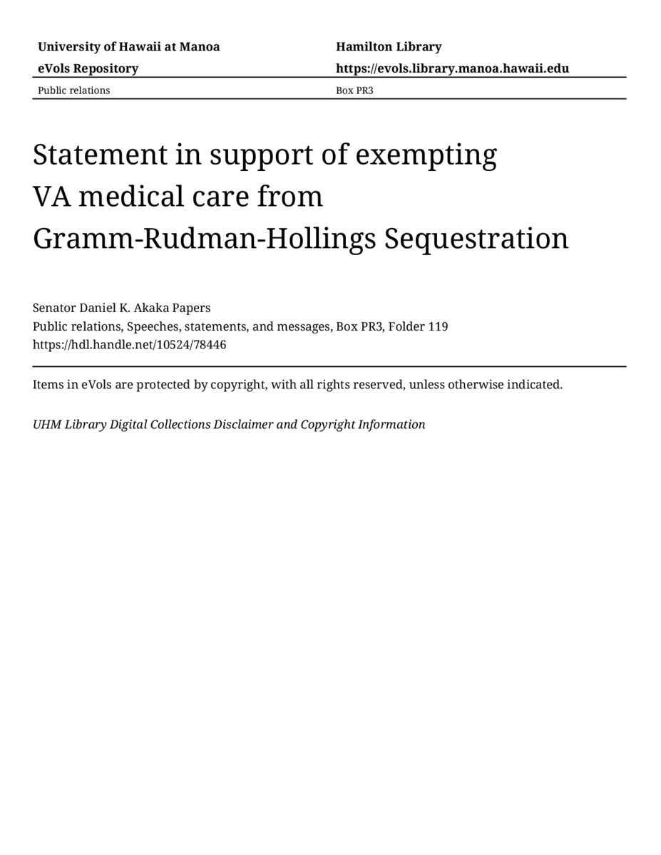 - Statement in support of exempting VA medical care from Gramm-Rudman-Hollings Sequestration