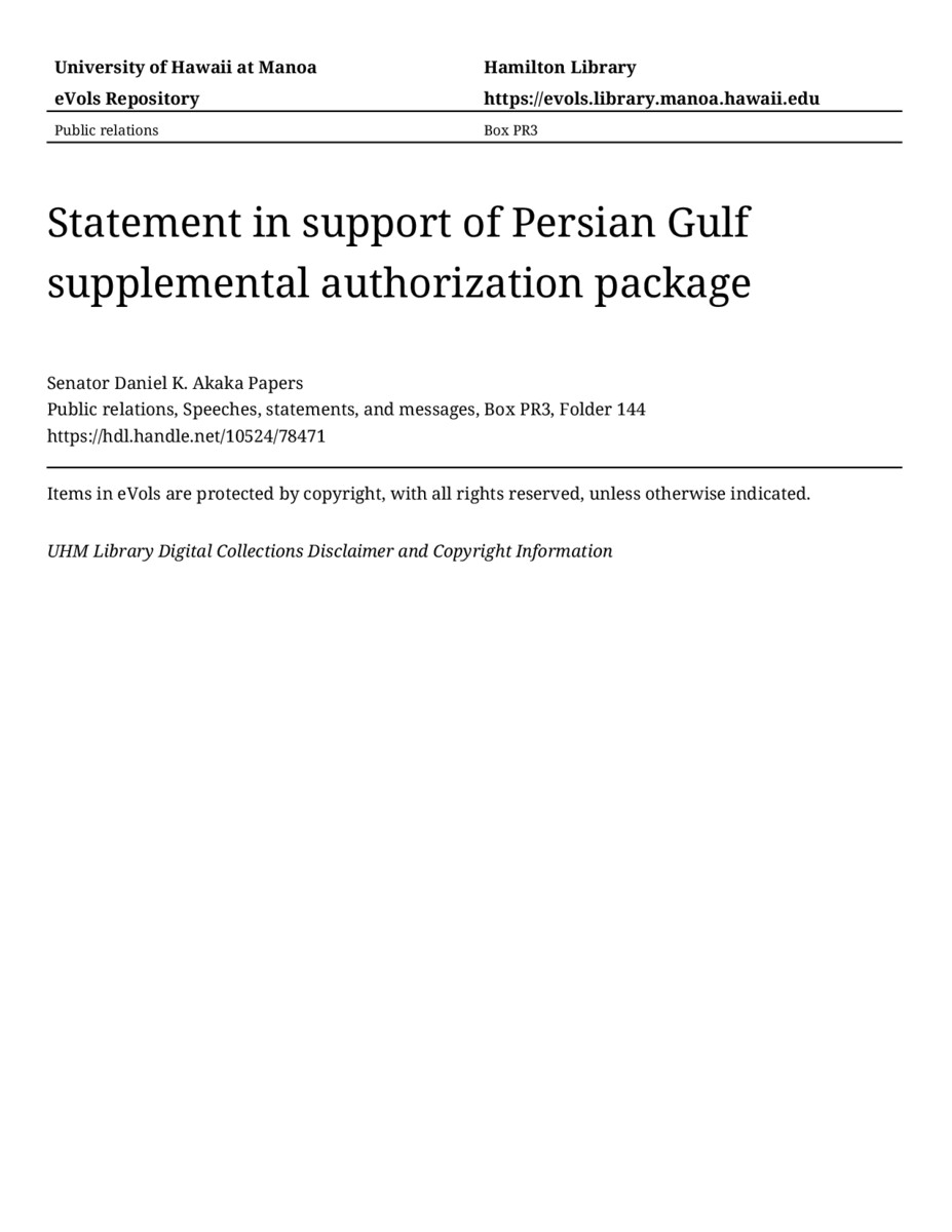 - Statement in support of Persian Gulf supplemental authorization package