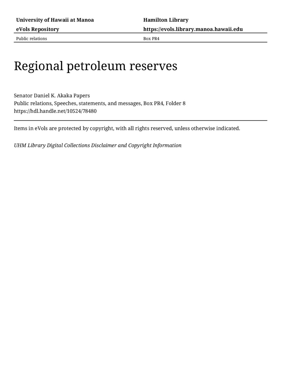 Regional petroleum reserves, April 17, 1991, MANUSCRIPT-HCPC00010, Public relations, Speeches, statements, and messages, Box PR4, Folder 8, Senator Daniel K. Akaka Papers, Hawaiʻi Congressional Papers Collection, University of Hawaiʻi at Mānoa Library, Honolulu, HI. https://congressarchives.org/catalog/10524_78480 (accessed March 20, 2026).