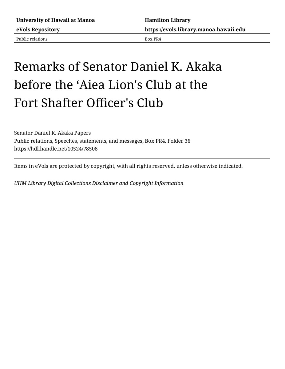 - Remarks of Senator Daniel K. Akaka before the ʻAiea Lion's Club at the Fort Shafter Officer's Club