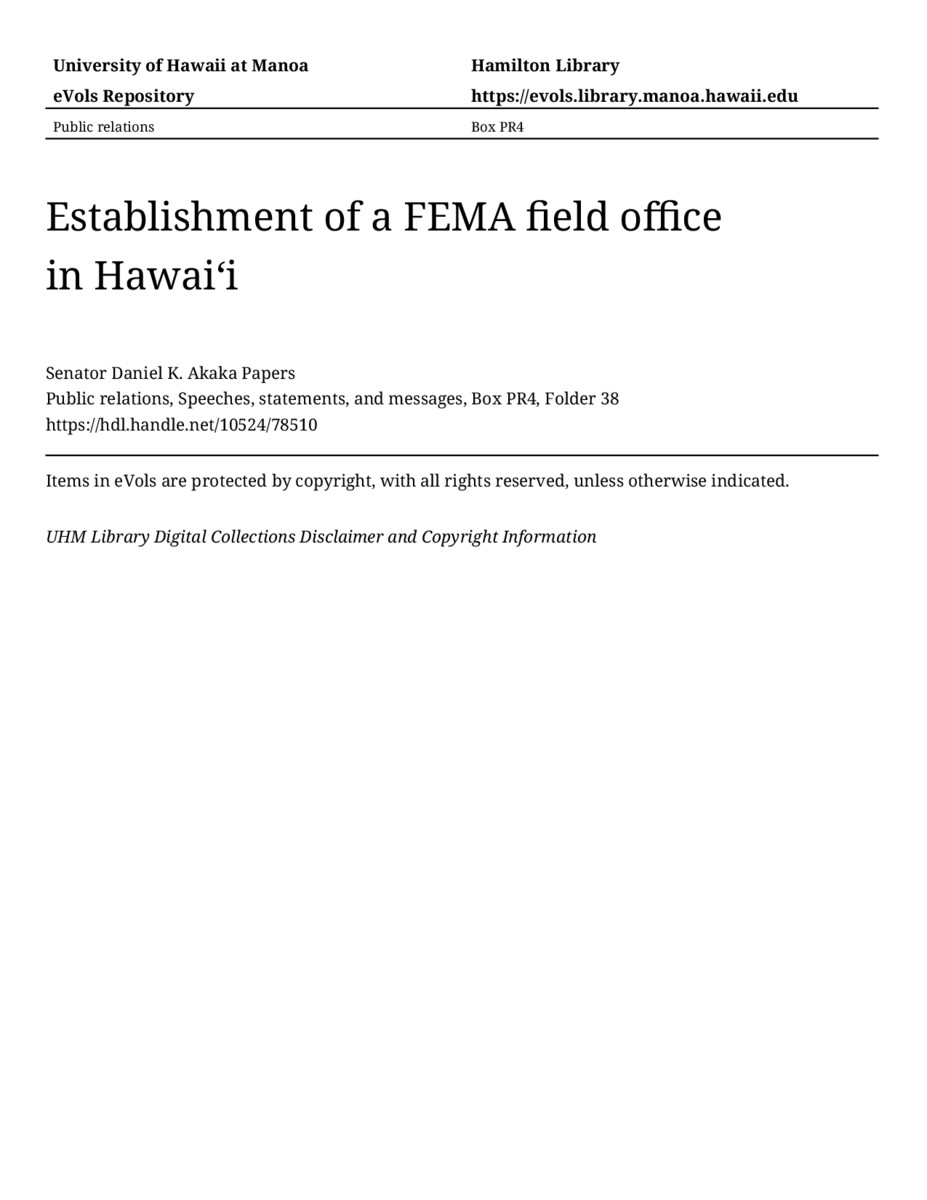 Establishment of a FEMA field office in Hawaiʻi, June 4, 1991, MANUSCRIPT-HCPC00010, Public relations, Speeches, statements, and messages, Box PR4, Folder 38, Senator Daniel K. Akaka Papers, Hawaiʻi Congressional Papers Collection, University of Hawaiʻi at Mānoa Library, Honolulu, HI. https://congressarchives.org/catalog/10524_78510 (accessed March 18, 2026).