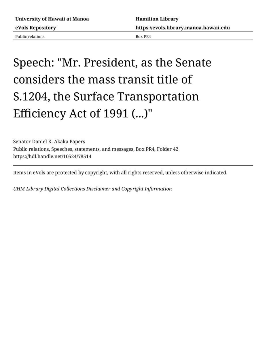 Speech: "Mr. President, as the Senate considers the mass transit title of S.1204, the Surface Transportation Efficiency Act of 1991 (...)", June 13, 1991, MANUSCRIPT-HCPC00010, Public relations, Speeches, statements, and messages, Box PR4, Folder 42, Senator Daniel K. Akaka Papers, Hawaiʻi Congressional Papers Collection, University of Hawaiʻi at Mānoa Library, Honolulu, HI. https://congressarchives.org/catalog/10524_78514 (accessed March 20, 2026).