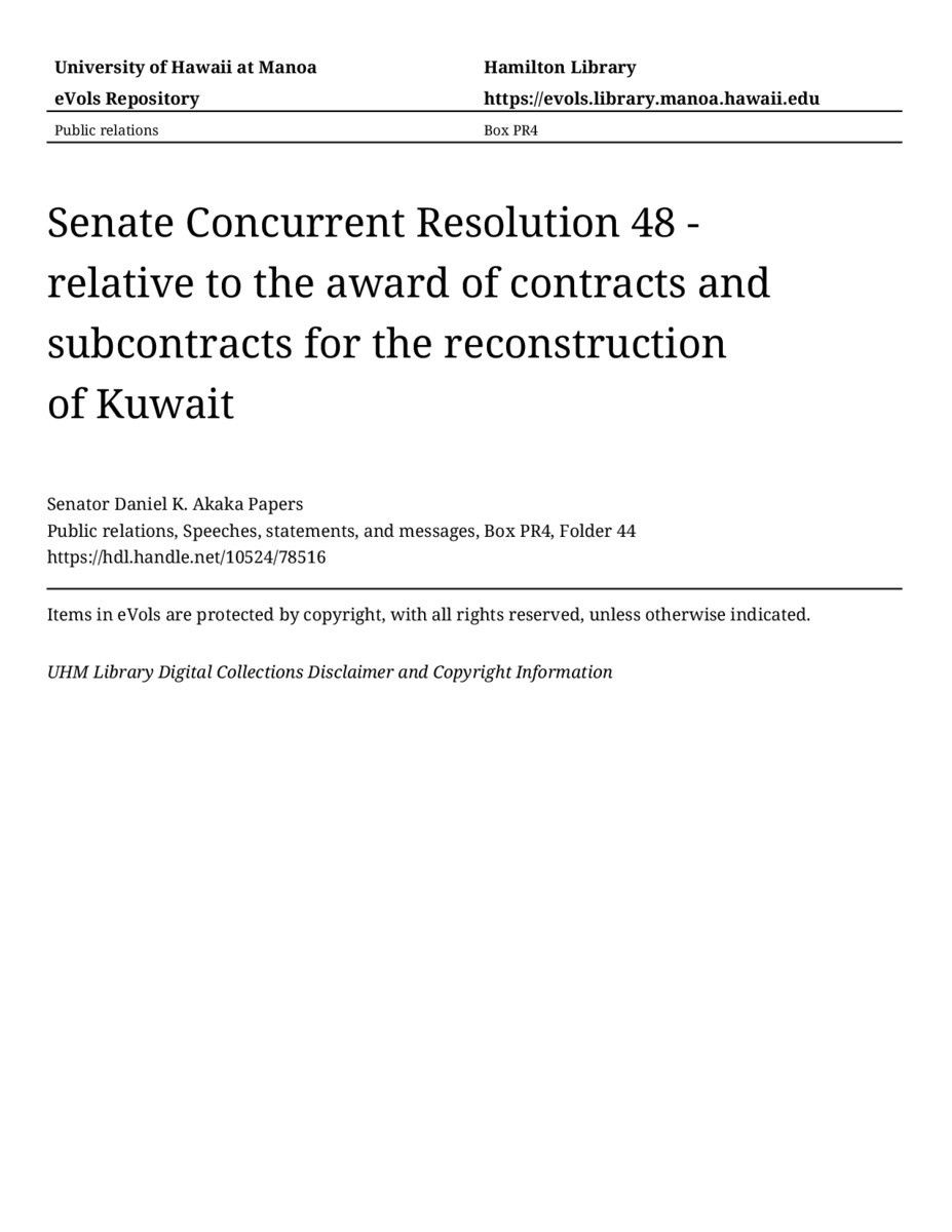 Senate Concurrent Resolution 48 - relative to the award of contracts and subcontracts for the reconstruction of Kuwait, June 17, 1991, MANUSCRIPT-HCPC00010, Public relations, Speeches, statements, and messages, Box PR4, Folder 44, Senator Daniel K. Akaka Papers, Hawaiʻi Congressional Papers Collection, University of Hawaiʻi at Mānoa Library, Honolulu, HI. https://congressarchives.org/catalog/10524_78516 (accessed March 20, 2026).