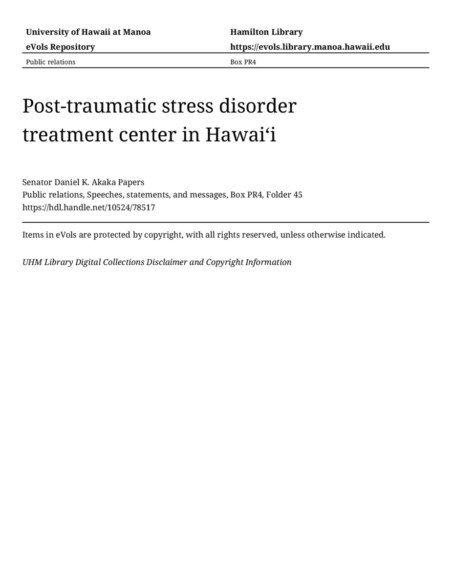 Post-traumatic stress disorder treatment center in Hawaiʻi, June 18, 1991, MANUSCRIPT-HCPC00010, Public relations, Speeches, statements, and messages, Box PR4, Folder 45, Senator Daniel K. Akaka Papers, Hawaiʻi Congressional Papers Collection, University of Hawaiʻi at Mānoa Library, Honolulu, HI. https://congressarchives.org/catalog/10524_78517 (accessed March 21, 2026).