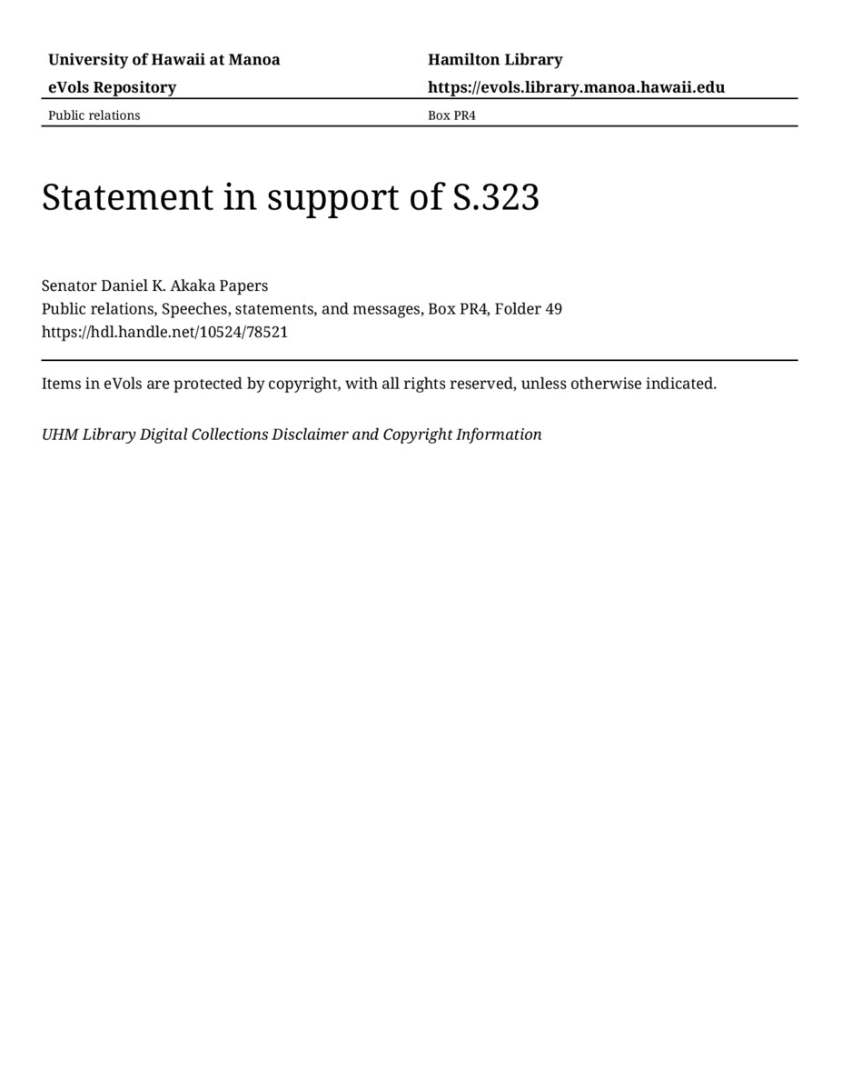 Statement in support of S.323, July 16, 1991, MANUSCRIPT-HCPC00010, Public relations, Speeches, statements, and messages, Box PR4, Folder 49, Senator Daniel K. Akaka Papers, Hawaiʻi Congressional Papers Collection, University of Hawaiʻi at Mānoa Library, Honolulu, HI. https://congressarchives.org/catalog/10524_78521 (accessed March 21, 2026).