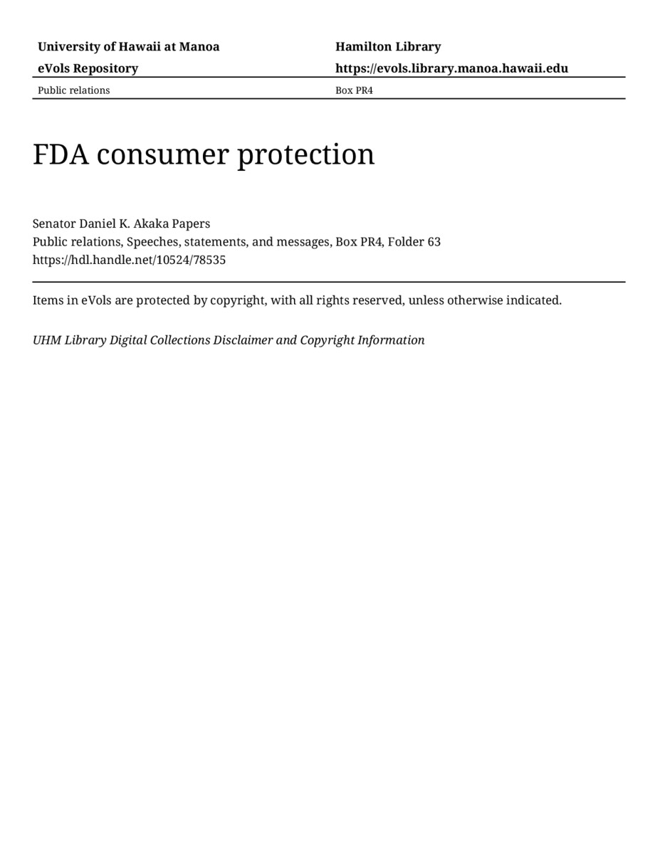 FDA consumer protection, September 27, 1991, MANUSCRIPT-HCPC00010, Public relations, Speeches, statements, and messages, Box PR4, Folder 63, Senator Daniel K. Akaka Papers, Hawaiʻi Congressional Papers Collection, University of Hawaiʻi at Mānoa Library, Honolulu, HI. https://congressarchives.org/catalog/10524_78535 (accessed March 21, 2026).