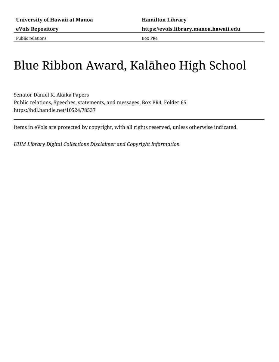 Blue Ribbon Award, Kalāheo High School, October 3, 1991, MANUSCRIPT-HCPC00010, Public relations, Speeches, statements, and messages, Box PR4, Folder 65, Senator Daniel K. Akaka Papers, Hawaiʻi Congressional Papers Collection, University of Hawaiʻi at Mānoa Library, Honolulu, HI. https://congressarchives.org/catalog/10524_78537 (accessed March 20, 2026).