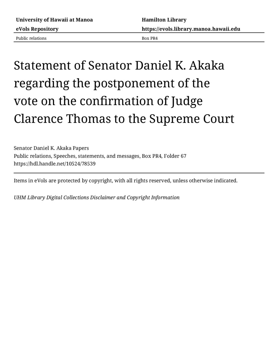 Statement of Senator Daniel K. Akaka regarding the postponement of the vote on the confirmation of Judge Clarence Thomas to the Supreme Court, October 8, 1991, MANUSCRIPT-HCPC00010, Public relations, Speeches, statements, and messages, Box PR4, Folder 67, Senator Daniel K. Akaka Papers, Hawaiʻi Congressional Papers Collection, University of Hawaiʻi at Mānoa Library, Honolulu, HI. https://congressarchives.org/catalog/10524_78539 (accessed March 20, 2026).