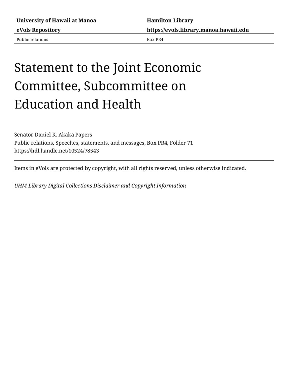 - Statement to the Joint Economic Committee, Subcommittee on Education and Health