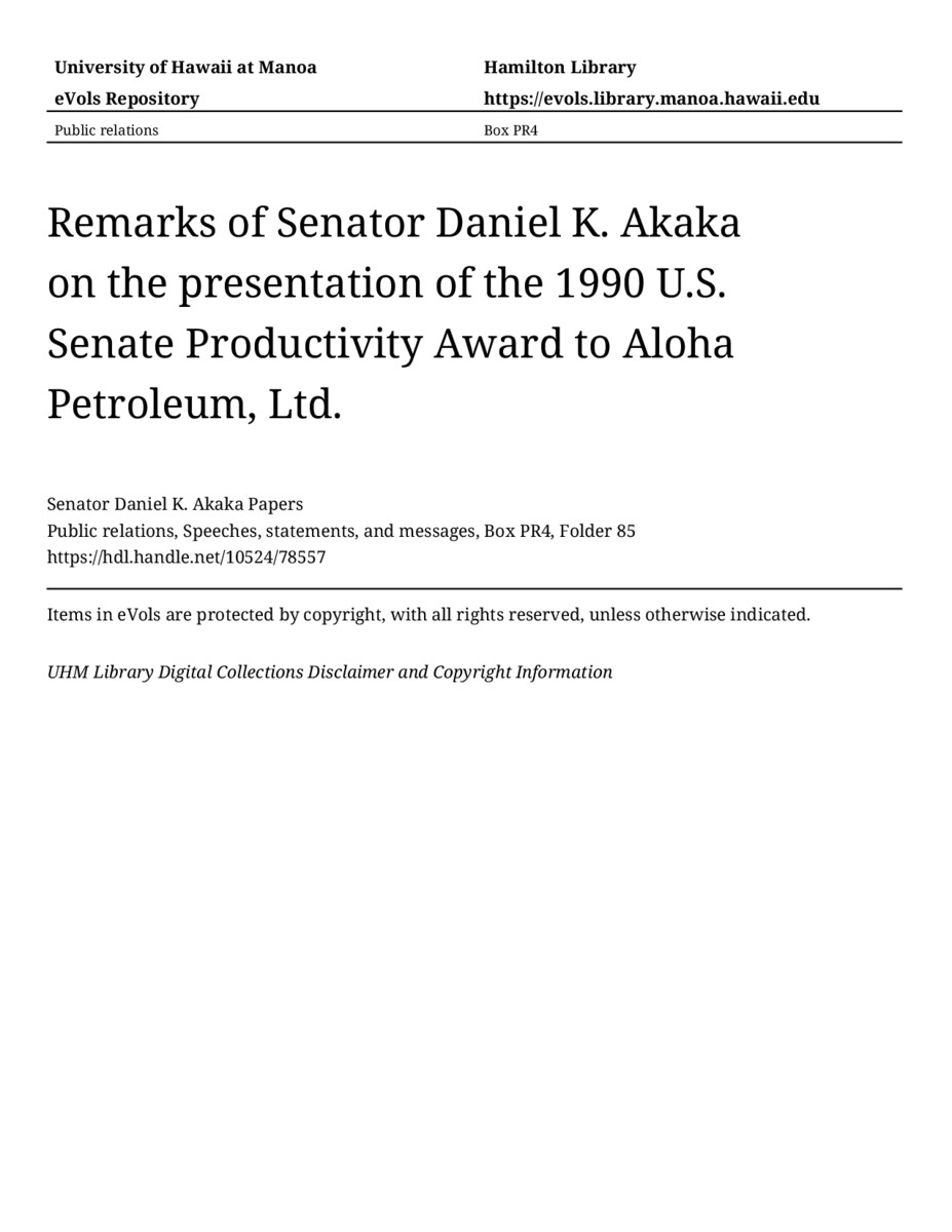 Remarks of Senator Daniel K. Akaka on the presentation of the 1990 U.S. Senate Productivity Award to Aloha Petroleum, Ltd., February 11, 1992, MANUSCRIPT-HCPC00010, Public relations, Speeches, statements, and messages, Box PR4, Folder 85, Senator Daniel K. Akaka Papers, Hawaiʻi Congressional Papers Collection, University of Hawaiʻi at Mānoa Library, Honolulu, HI. https://congressarchives.org/catalog/10524_78557 (accessed March 17, 2026).
