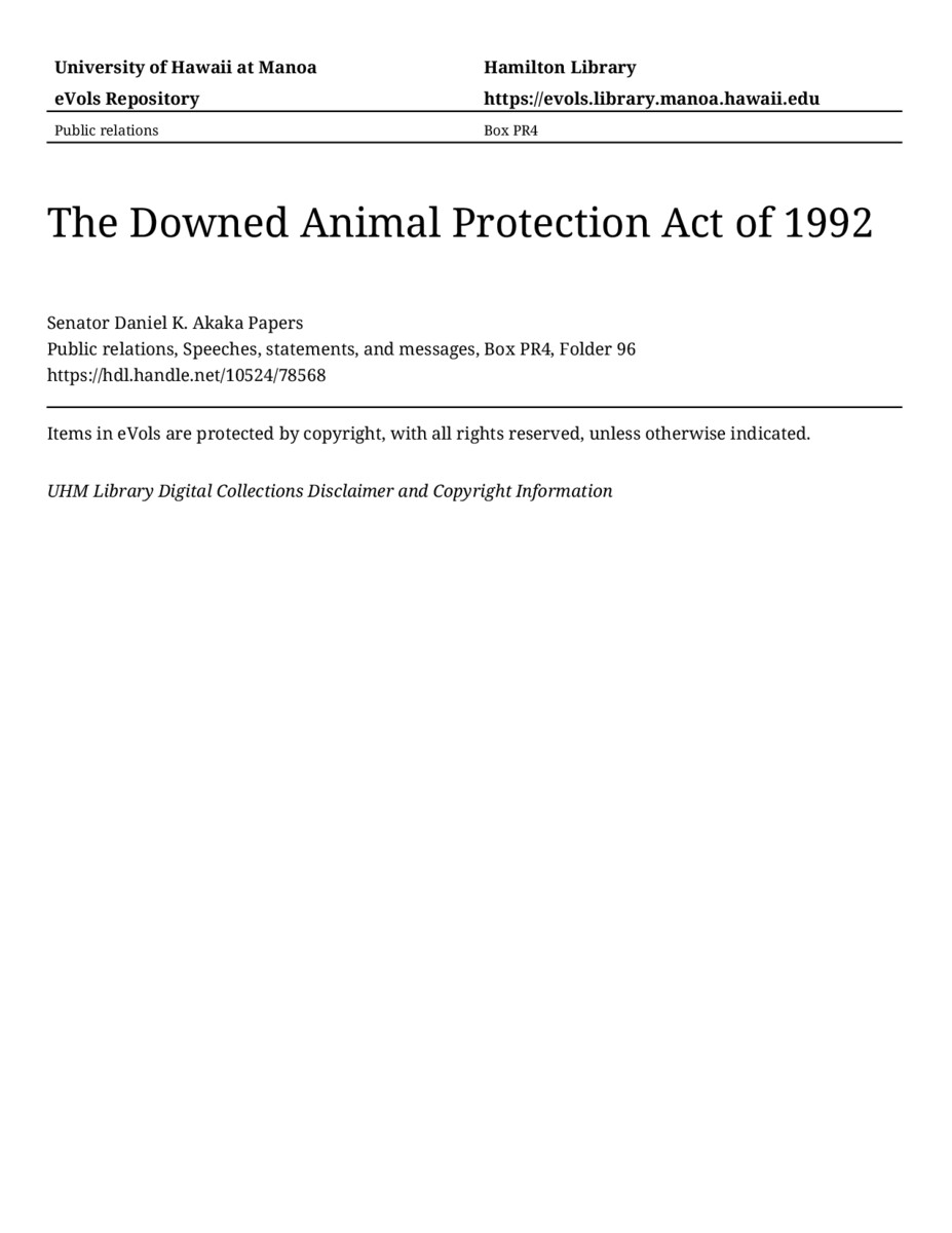 The Downed Animal Protection Act of 1992, March 13, 1992, MANUSCRIPT-HCPC00010, Public relations, Speeches, statements, and messages, Box PR4, Folder 96, Senator Daniel K. Akaka Papers, Hawaiʻi Congressional Papers Collection, University of Hawaiʻi at Mānoa Library, Honolulu, HI. https://congressarchives.org/catalog/10524_78568 (accessed March 20, 2026).