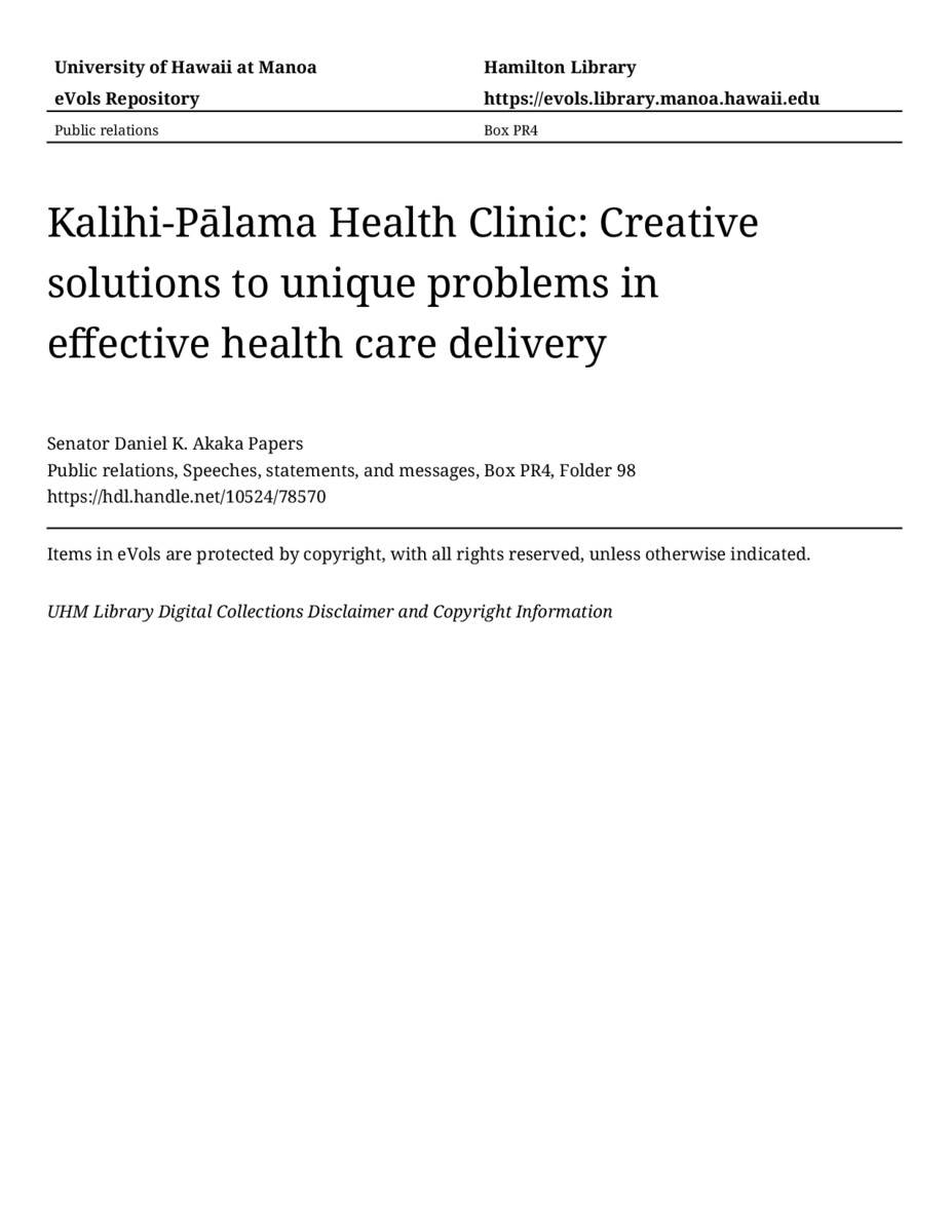 - Kalihi-Pālama Health Clinic: Creative solutions to unique problems in effective health care delivery
