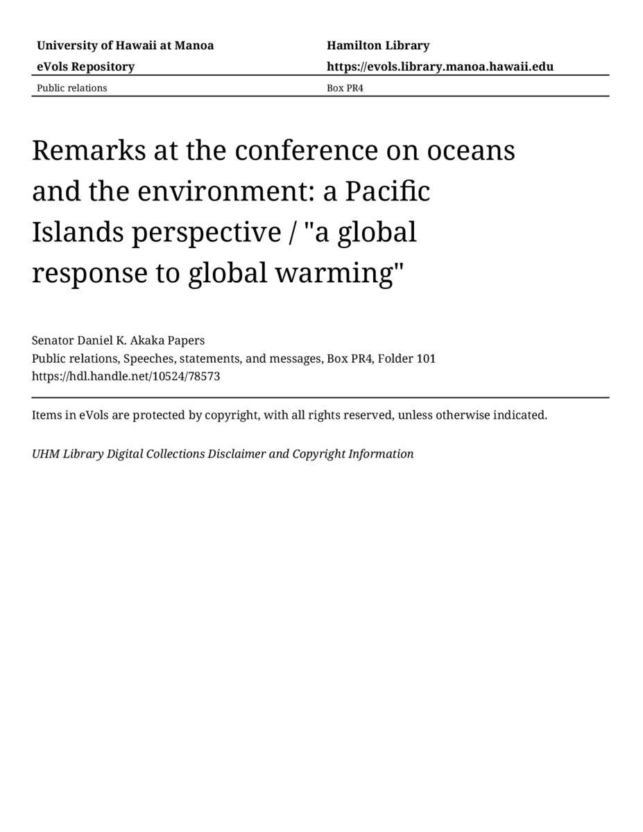 Remarks at the conference on oceans and the environment: a Pacific Islands perspective / "a global response to global warming", April 23, 1992, MANUSCRIPT-HCPC00010, Public relations, Speeches, statements, and messages, Box PR4, Folder 101, Senator Daniel K. Akaka Papers, Hawaiʻi Congressional Papers Collection, University of Hawaiʻi at Mānoa Library, Honolulu, HI. https://congressarchives.org/catalog/10524_78573 (accessed March 19, 2026).