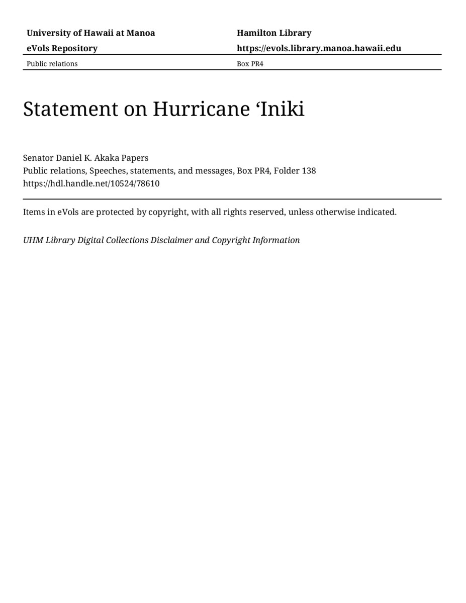 Statement on Hurricane ʻIniki, September 15, 1992, MANUSCRIPT-HCPC00010, Public relations, Speeches, statements, and messages, Box PR4, Folder 138, Senator Daniel K. Akaka Papers, Hawaiʻi Congressional Papers Collection, University of Hawaiʻi at Mānoa Library, Honolulu, HI. https://congressarchives.org/catalog/10524_78610 (accessed March 18, 2026).