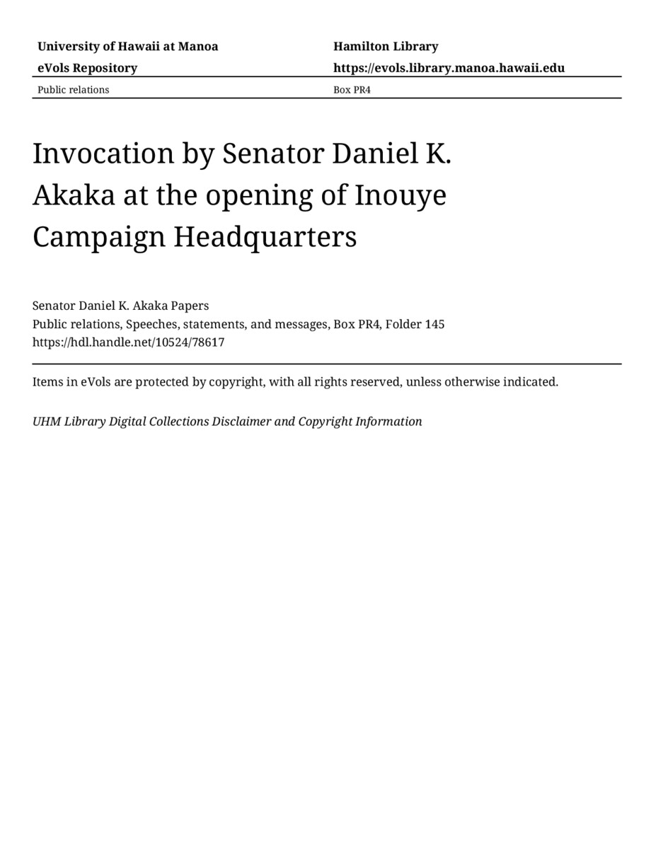 - Invocation by Senator Daniel K. Akaka at the opening of Inouye Campaign Headquarters