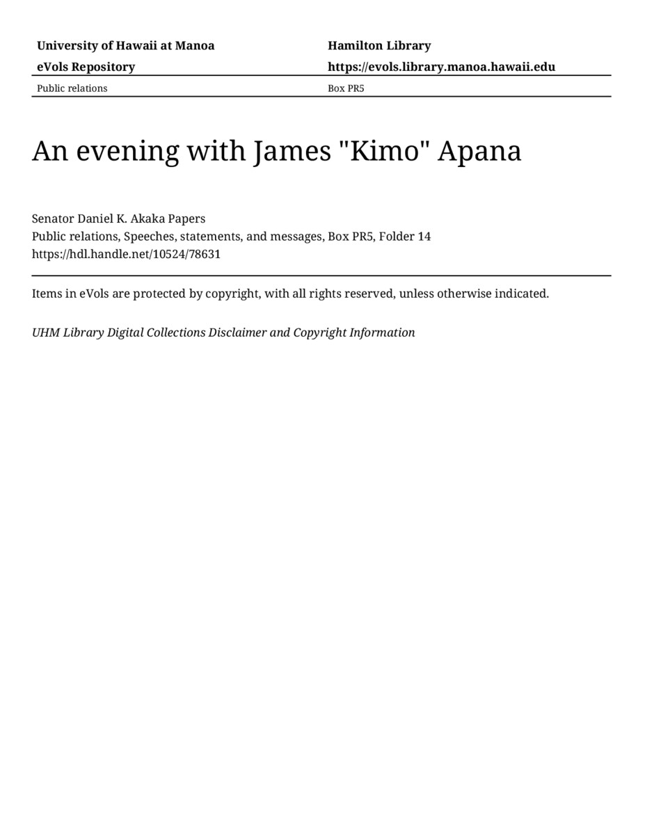 An evening with James "Kimo" Apana, October 28, 1992, MANUSCRIPT-HCPC00010, Public relations, Speeches, statements, and messages, Box PR5, Folder 14, Senator Daniel K. Akaka Papers, Hawaiʻi Congressional Papers Collection, University of Hawaiʻi at Mānoa Library, Honolulu, HI. https://congressarchives.org/catalog/10524_78631 (accessed March 21, 2026).