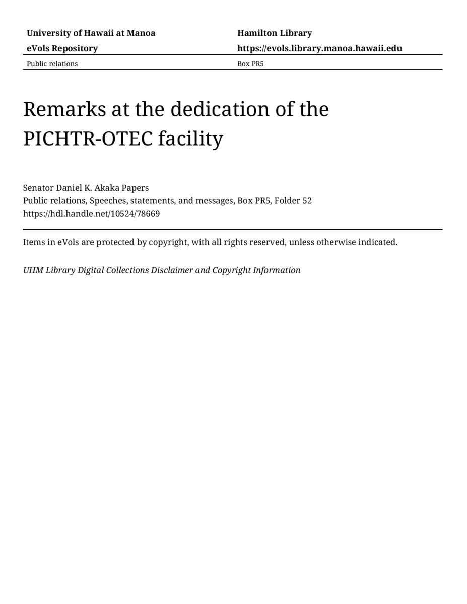 Remarks at the dedication of the PICHTR-OTEC facility, April 16, 1993, MANUSCRIPT-HCPC00010, Public relations, Speeches, statements, and messages, Box PR5, Folder 52, Senator Daniel K. Akaka Papers, Hawaiʻi Congressional Papers Collection, University of Hawaiʻi at Mānoa Library, Honolulu, HI. https://congressarchives.org/catalog/10524_78669 (accessed March 20, 2026).
