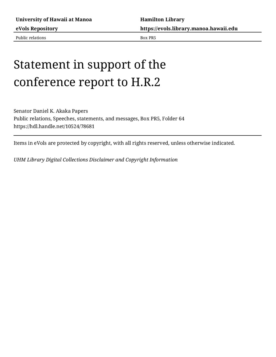 Statement in support of the conference report to H.R.2, May 11, 1993, MANUSCRIPT-HCPC00010, Public relations, Speeches, statements, and messages, Box PR5, Folder 64, Senator Daniel K. Akaka Papers, Hawaiʻi Congressional Papers Collection, University of Hawaiʻi at Mānoa Library, Honolulu, HI. https://congressarchives.org/catalog/10524_78681 (accessed March 20, 2026).