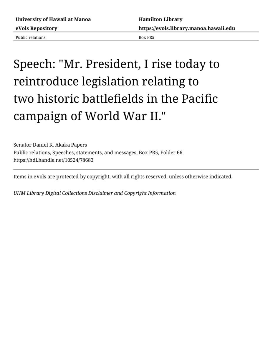 Speech: "Mr. President, I rise today to reintroduce legislation relating to two historic battlefields in the Pacific campaign of World War II.", May 18, 1993, MANUSCRIPT-HCPC00010, Public relations, Speeches, statements, and messages, Box PR5, Folder 66, Senator Daniel K. Akaka Papers, Hawaiʻi Congressional Papers Collection, University of Hawaiʻi at Mānoa Library, Honolulu, HI. https://congressarchives.org/catalog/10524_78683 (accessed March 20, 2026).