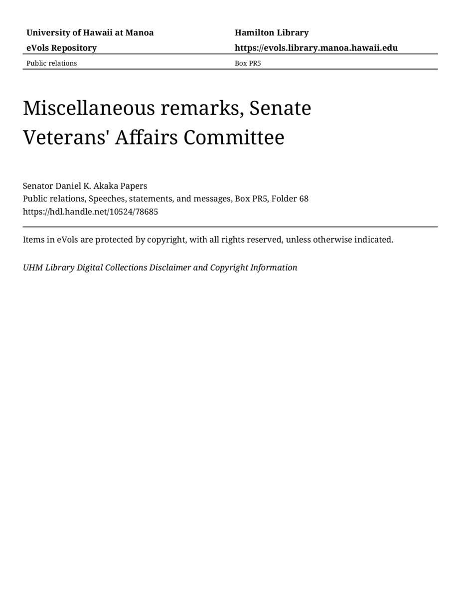 Miscellaneous remarks, Senate Veterans' Affairs Committee, May 19, 1993, MANUSCRIPT-HCPC00010, Public relations, Speeches, statements, and messages, Box PR5, Folder 68, Senator Daniel K. Akaka Papers, Hawaiʻi Congressional Papers Collection, University of Hawaiʻi at Mānoa Library, Honolulu, HI. https://congressarchives.org/catalog/10524_78685 (accessed March 20, 2026).