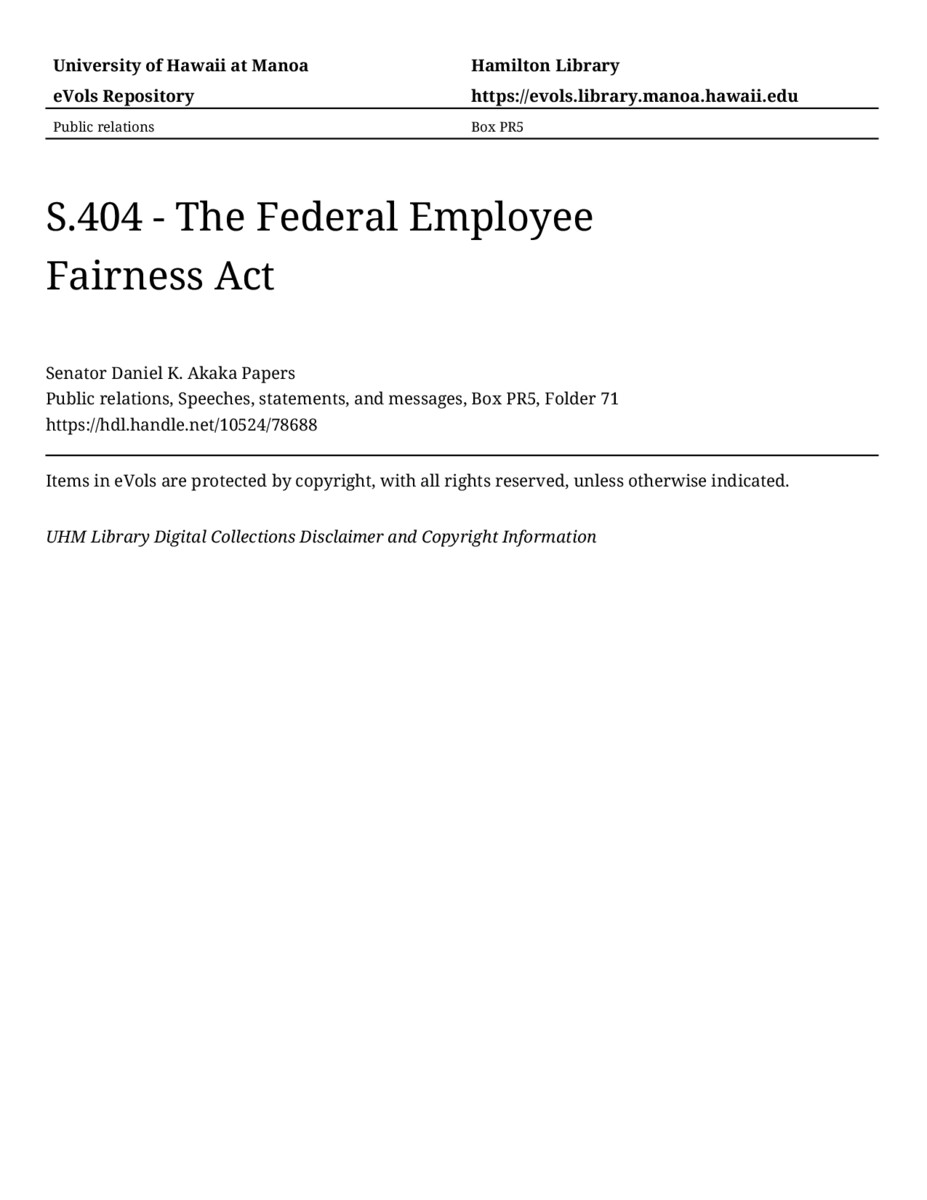 S.404 - The Federal Employee Fairness Act, May 26, 1993, MANUSCRIPT-HCPC00010, Public relations, Speeches, statements, and messages, Box PR5, Folder 71, Senator Daniel K. Akaka Papers, Hawaiʻi Congressional Papers Collection, University of Hawaiʻi at Mānoa Library, Honolulu, HI. https://congressarchives.org/catalog/10524_78688 (accessed March 20, 2026).